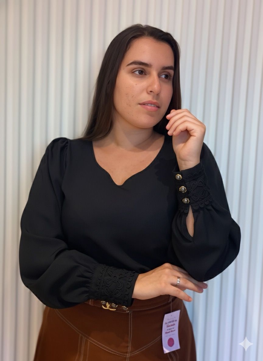 Um toque de sofisticação para o seu dia a dia! Blusa social preta com punhos delicados em renda e botões, perfeita para combinar com saias, calças sociais ou jeans. Elegante, confortável e versátil, para momentos de trabalho ou eventos especiais.